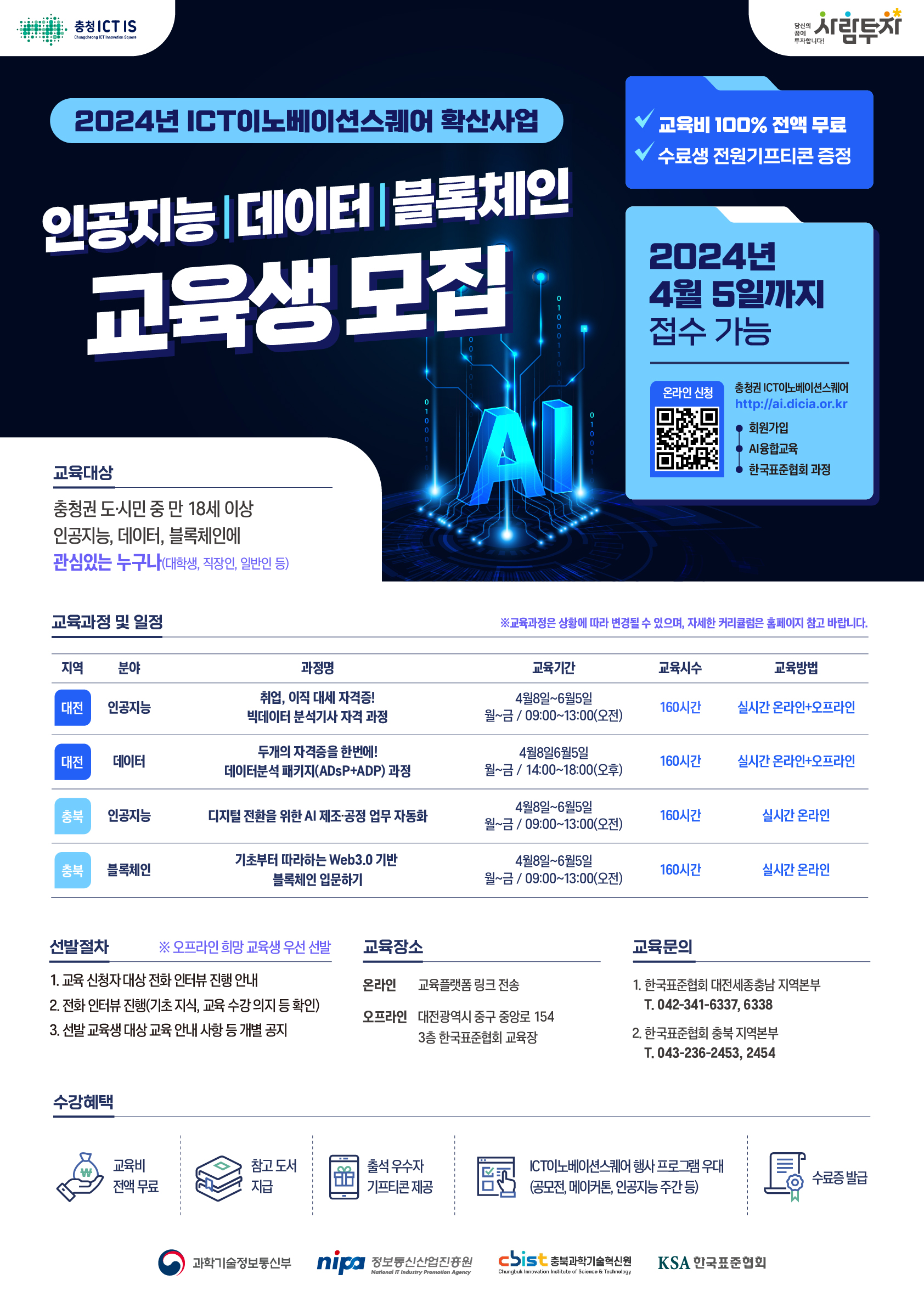 ※ 선발 시, 오프라인 수강생 우대 ※ 오프라인 교육장소 한국표준협회 교육장 (대전광역시 중구 중앙로 154 3층 한국표준협회) |